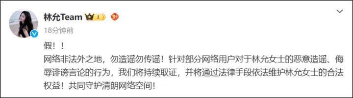 林允工作室@林允Team 也发文辟谣:假!!网络非法外之地,勿造谣勿传谣!针对部分网络用户对于林允女士的恶意造谣、侮辱诽谤言论的行为,我们将持续取证,并将通过法律手段依法维护林允女士的合法权益!共同守护清朗网络空间!
